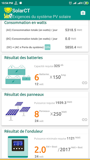 SolarCT est une calculatrice d'application pour les exigences des composants du système solaire comme le nombre de panneaux solaires et de batteries requis, la taille de l'onduleur et du chargeur du contrôleur, et comment connecter les panneaux solaires et les batteries en série et en parallèle en fonction de la tension du système/onduleur.