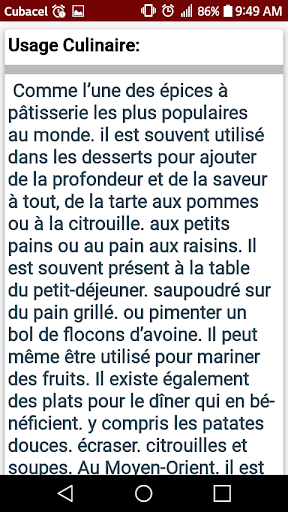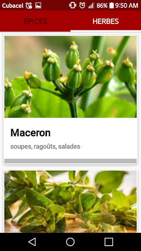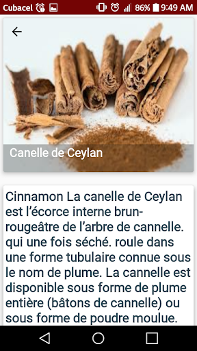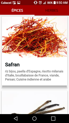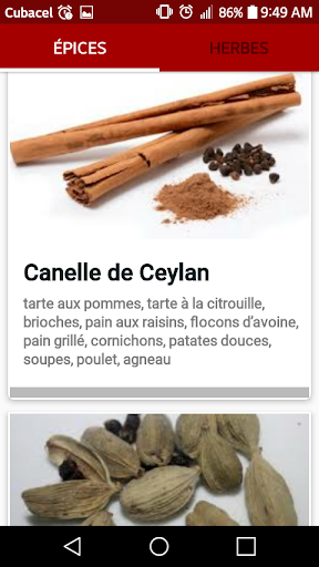 Spices, Herbs and their Culinary Uses est une application GRATUITE disponible pour Android qui contient une grande variété d ' épices , leur description et leurs utilisations culinaires selon les types des aliments.