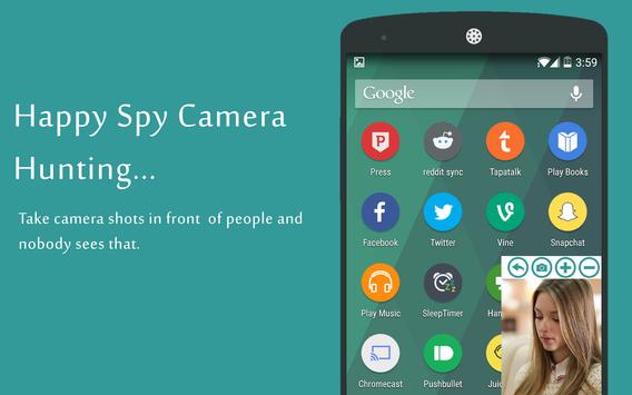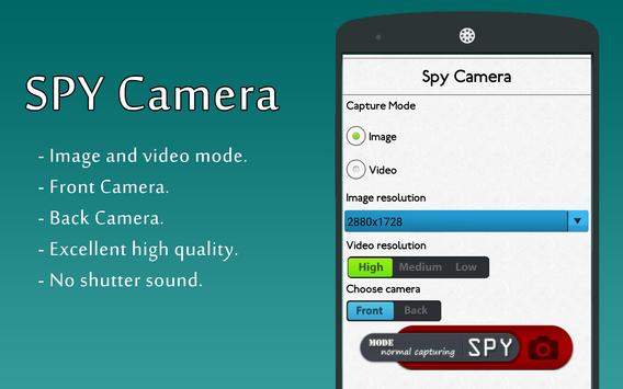 Spy Camera is a hidden Camera, What are you waiting for!!!! Take camera shots in front of people and nobody sees that. Features: - Image and video mode. - Front Camera. - Back Camera. - Excellent high quality. - No shutter sound.
