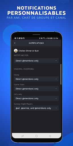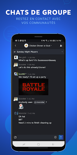 Notifications personnalisables : grâce aux notifications mobiles, vous ne manquerez jamais un message ou une invitation à jouer. Vous pouvez personnaliser vos notifications en fonction de vos amis, chats de groupe ou canaux de chat.