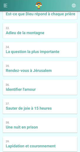 Les enfants adorent les histoires! Vous aussi, bien sûr. Dans l'application «Histoires pour enfants», vous trouverez de nombreuses histoires qui parlent du Dieu vivant. Il t'a créé et t'aime. Car Dieu est amour! Vous découvrirez cela et bien plus encore dans l'application.