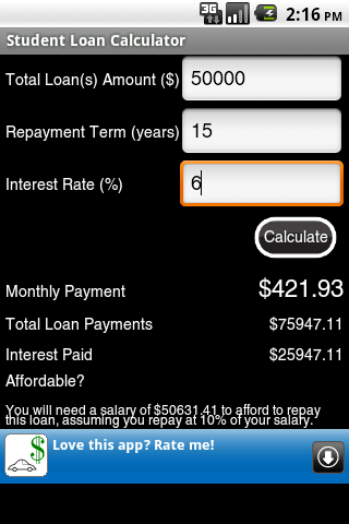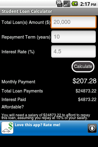 Easy and simple student loan calculator. Calculate monthly student loan payments and figure out accumulated interest over repayment period. Also, calculates student loan payment affordability. Student loan repayment calculator.