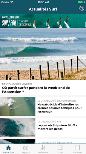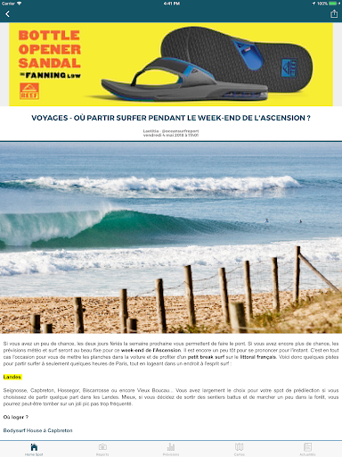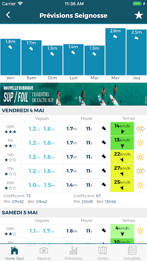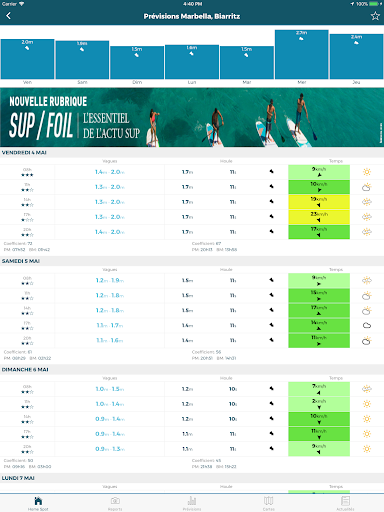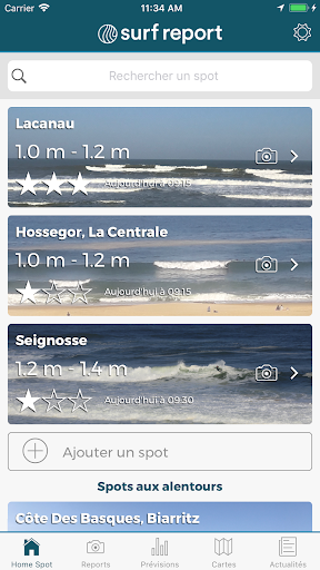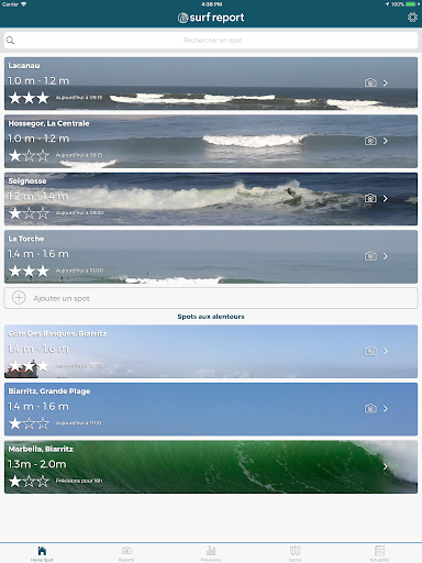 Une page d'accueil personnalisable : Choisissez vos spots favoris pour découvrir en un coup d'œil les prévisions et les reports du jour.