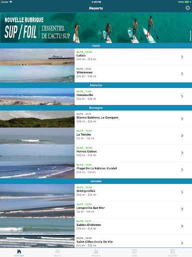 Plus de 30 reports quotidiens : Dans toutes les régions de France, mais aussi au Maroc et dans les DOM-TOM nos reporters vous offrent la possibilité de surveiller les conditions en photo ou vidéo avec un conseil personnalisé. Débutant ou confirmé, le reporter précise également à quel niveau correspondent les vagues du jour.
