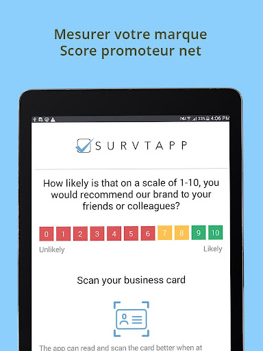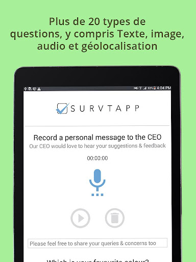 Survtapp Survey Software est la solution idéale pour la collecte des commentaires du client, la capture de plomb, l'étude de marché, l'inscription des utilisateurs, les formulaires de commande, les inspections et les audits et les kiosques interactifs