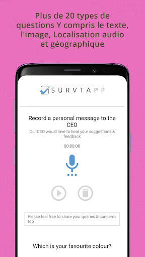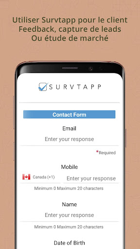 Survtapp vous permet de créer des enquêtes et des formulaires complets en quelques minutes et votre application de recherche complète pour la capture de plomb, le feedback du client ou tout type de collecte de données. Survtapp Survey App, même Works Offline sans connexion Internet.
