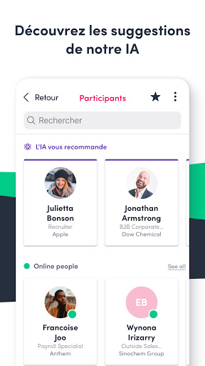 Selon vos besoins professionnels, l’IA de Swapcard vous suggère des participants avec des intérêts en communs. Découvrez les profils suggérés, discutez avec eux grâce au chat, et planifiez des rendez-vous lors de l'événement.