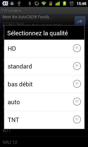 Dans la majorité des cas, les flux automatiques / standards fonctionnent correctement sur les téléphones récents. Peu de téléphones / tablettes ont la puissance requise pour le moment pour lire les chaînes en HD de façon convenable.
