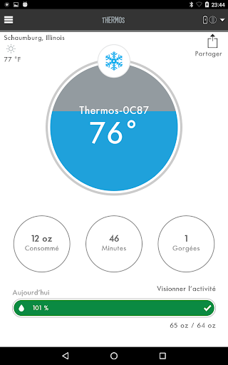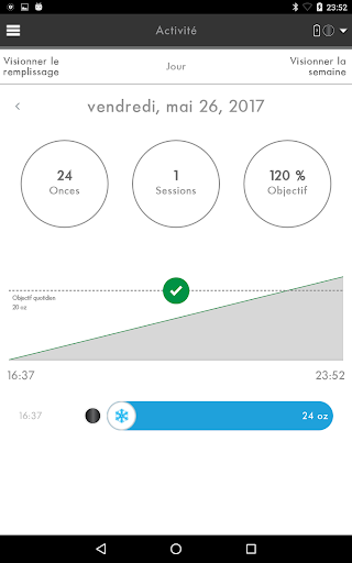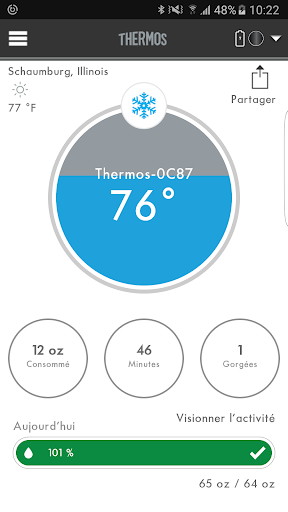 Atteignez vos objectifs d’hydratation et mettez en pratique un mode de vie sain grâce à l’application Thermos Smart Lid. Cette application doit être utilisée de manière conjointe avec la bouteille d’hydratation connectée 720 ml (24 oz) avec couvercle intelligent Thermos®. Cette bouteille, équipée d’un couvercle intelligent mesure votre consommation de liquide tout en communiquant en temps réel la température de votre boisson. Non seulement cette application vous permet de suivre chacune de vos gorgées mais elle surveille également la progression de votre hydratation globale quotidienne, hebdomadaire et mensuelle. Grâce au calculateur d’hydratation intégré, vous pouvez calculer votre consommation recommandée en fonction de votre âge, votre sexe, votre taille, votre poids, et votre activité. L’eau est un élément essentiel pour rester hydraté et en bonne santé. Avec la Bouteille d’hydratation connectée avec couvercle intelligent Thermos®, nous vous aidons à concrétiser ces objectifs !
