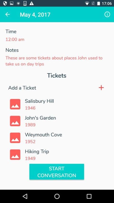 Ticket to Talk hopes to encourage conversation between younger people and their grandparents, friends, or other people they care for who are experiencing dementia. The app is designed to help collect and curate digital media ("tickets") to be used to prompt and stimulate talk, conversation, and reminiscence between younger people and those they are close to with dementia.