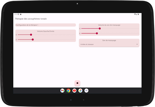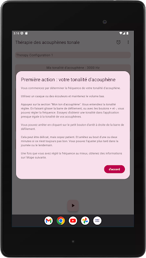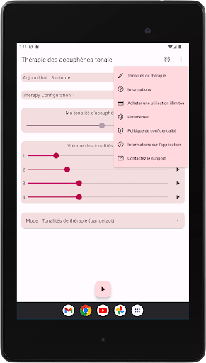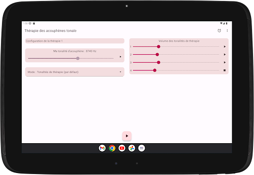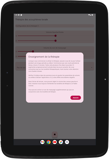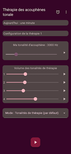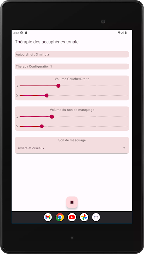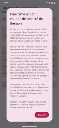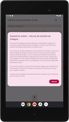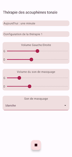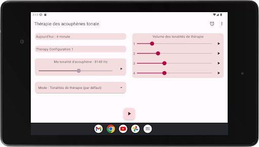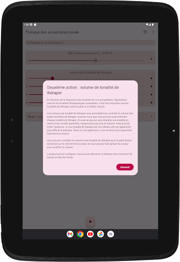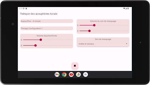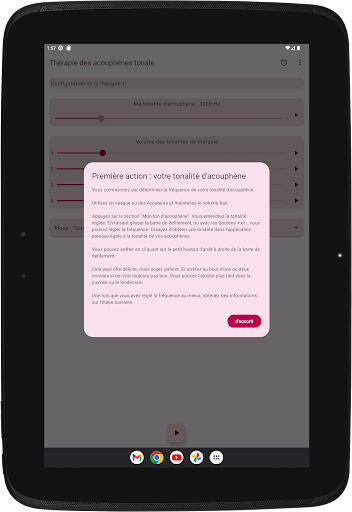 L'application configure quatre tonalités de thérapie, deux en dessous et deux au-dessus de votre tonalité d'acouphène. La neuromodulation acoustique utilise ces tonalités thérapeutiques en séries de douze avec un court intervalle de temps pour réinitialiser votre tonalité d'acouphène. Avant de commencer à jouer ces séries de tonalités de thérapie, vous devez vérifier si vous entendez chaque tonalité de thérapie au même volume. Vous pouvez adapter le volume de chaque tonalité de thérapie si nécessaire. Ensuite, vous pouvez commencer à jouer les tonalités de thérapie. Pendant la lecture, vous pouvez modifier le volume des canaux gauche et droit sur l'écran principal. Vous pouvez fermer l'écran principal et le rouvrir quand vous le souhaitez. La lecture des tonalités de thérapie se produit en arrière-plan, vous voyez l'icône de l'application dans la barre de notification pendant son exécution.