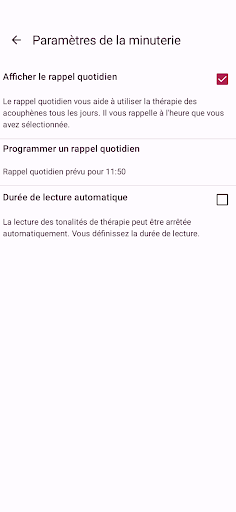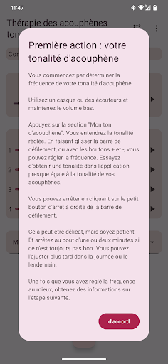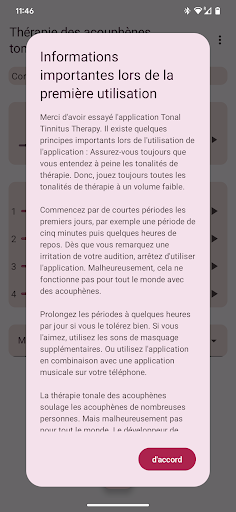 Si vous souffrez d'hyperacousie, soyez prudent lorsque vous utilisez l'application. Commencez par quelques courtes périodes d'utilisation à très faible volume. Lorsque les tonalités de thérapie provoquent des effets négatifs, ne continuez pas à utiliser l'application.