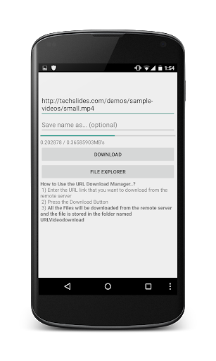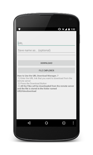 L'application est conçue de manière très simple, entrez simplement l'URL que vous souhaitez télécharger et appuyer sur le bouton de téléchargement.L'application rétrécira le fichier du serveur et recréer dans le téléphone local.