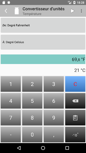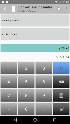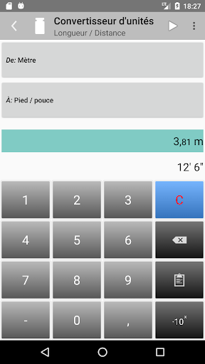 • Android 13 et supérieur: possibilité de sélectionner une langue différente dans Paramètres > Système > Langues et saisie > Langue des applis > Convertisseur d'unités