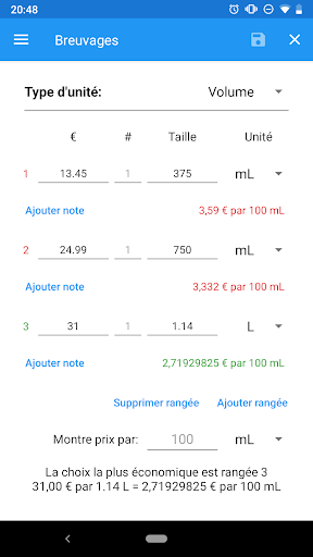 Faites-vous des courses? Devez-vous comparer entre des choses des tailles différentes? Cette appli va faire les maths pour décider lequel est le moins cher!