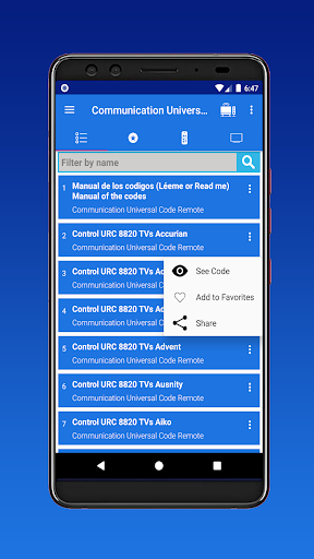 The codes of the remote controller of your Communication Universal this app allows you to quickly select thousands of codes from TV manufacturers so that you can configure your control or (Control) for television. Code of universal controllers of