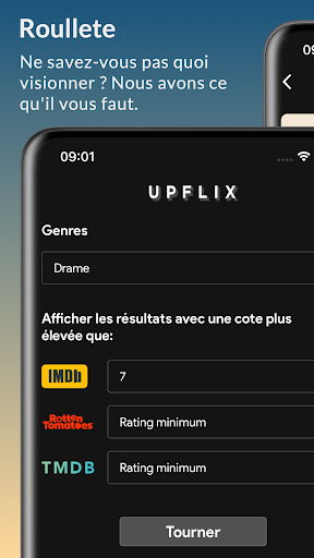 Le mode Roulette vous aide à choisir des films et des séries sur Netflix lorsque vous ne savez pas quoi regarder. Il suffit de créer vos filtres en fonction des catégories, des notes IMDB, TMDB et Rotten Tomatoes et Upflix vous suggérera quelque chose qui vous convient.