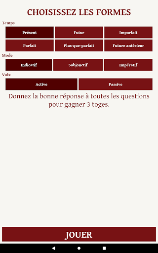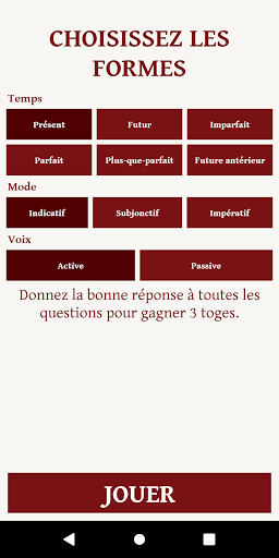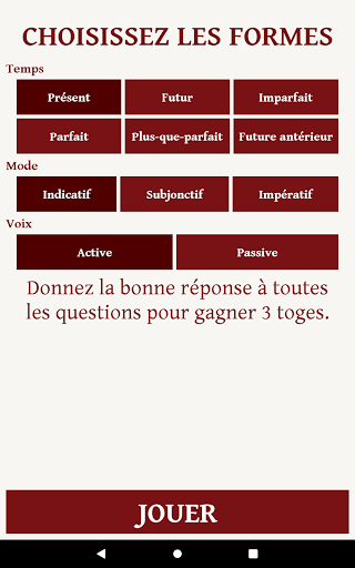 Vice Verba aide les élèves étudiant le latin à maîtriser les formes verbales. Les joueurs analysent des verbes et produisent des formes verbales pour gagner des toges. Une fois qu’ils ont collectionné suffisamment de toges, une imago d’un Romain célèbre est dévoilée. Collectionnez toutes les XII imagines, et n’oubliez pas de les retourner pour voir leurs stats ! Les joueurs peuvent personnaliser le jeu en choisissant le temps, la voix, et le mode du verbe, ainsi que l’inclusion ou non des macrons.