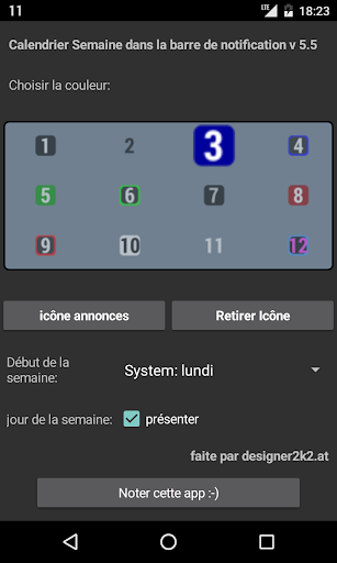 Vous pouvez choisir entre 12 styles d'icônes handcraftet, y compris le système propre ou les couleurs vives de fantaisie. Faire shure vous avez le numéro semaine toujours visible, ne pas le faire floue par d'autres notifications. 🎨