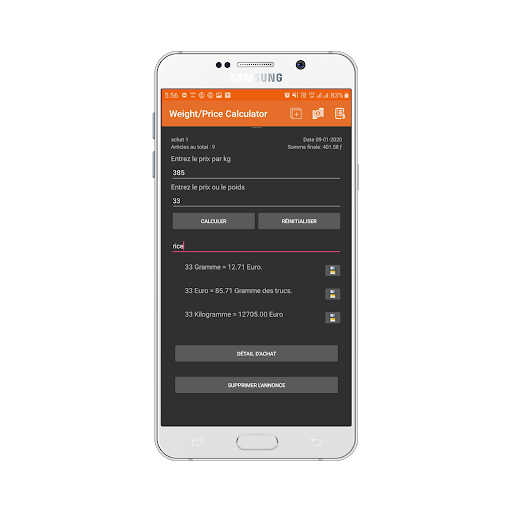 Beaucoup de gens vont au marché et ont du mal à faire ce type de calcul rapidement. Le commerçant local profite de cette faiblesse. Vous pouvez être trompé facilement par les commerçants locaux. Cette application vous donne le prix correct du poids donné et le poids correct du prix donné en fonction du prix au kilo de tout. Maintenant, cette application est disponible en anglais, français, russe, allemand, espagnol, italien, hindi et ourdou.