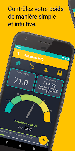 Vous contrôlez quotidiennement ce qu'il vous reste à perdre pour atteindre votre objectif. Le calcul de l’IMC obtenu vous permet d’être alerté si vous êtes en surpoids ou souffrez d’obésité et vous permet de prendre les bonnes décisions pour rester en bonne santé et vivre sainement.