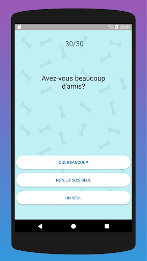 Vérifiez vos amis et comparez les résultats. Envoyez ce test à un ami ou laissez-le passer ce test sur votre smartphone pour savoir quel type de chien vos amis sont!