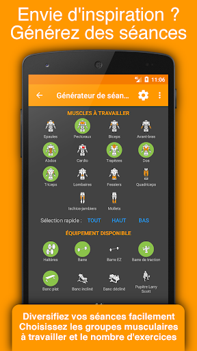• Générez votre programme de musculation personnalisé grâce au générateur de programmes, sélectionnez les groupes musculaires à travailler et le nombre d’exercices à faire et en 1 clic votre programme est prêt (service payant)
