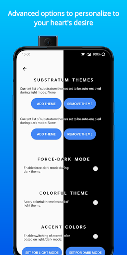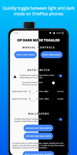 Cette application permet aux utilisateurs d'Oneplus de se rendre rapidement, commodément et basculer facilement entre les thèmes lumineux et sombres du système. L'application fournit une tuile de réglages rapides pouvant changer les thèmes à l'échelle du système, ainsi que la prise en charge de la modification automatique des thèmes basés sur l'heure de la journée (Sunrise / Sunset). En outre, l'utilisateur peut choisir des fonds d'écran personnalisés à appliquer automatiquement lorsque le téléphone est soit dans le thème léger ou sombre.