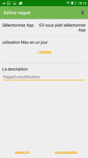 4) Rappel de surutilisation - suivant la tradition addictOmeter d'aider les utilisateurs à surmonter leurs habitudes de dépendance / surutilisation; Cette fonction vous permet de définir un rappel contextuel sur votre téléphone ou sur votre application afin de suivre l'utilisation de manière efficace.