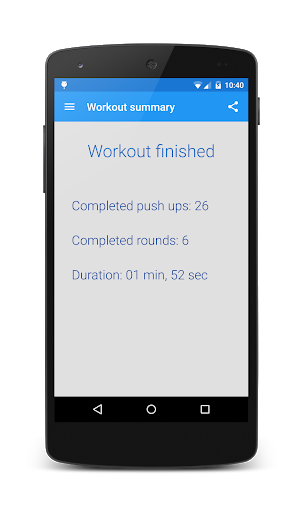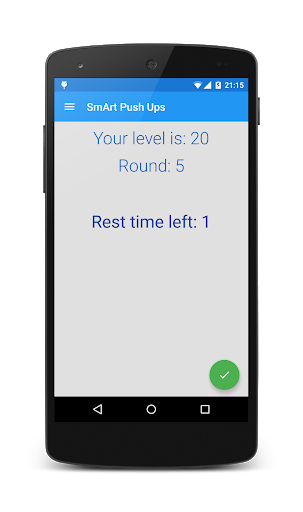 When starting the application for the first time, you will record the maximum number of correct push ups that you can make so you can set your Level. The Level can be changed at a later time, by accessing the "Set level" option of the menu whenever you are ready to adjust the maximum number of push ups that you can make during a burnout exercise.