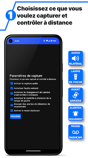 • Un contrôle complet de la caméra à distance (changement de caméra avant/arrière, lampe de poche, réglage du débit et de la résolution).