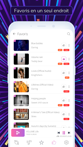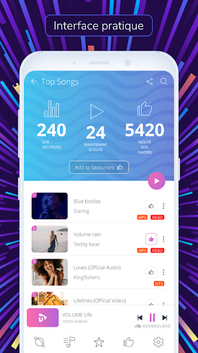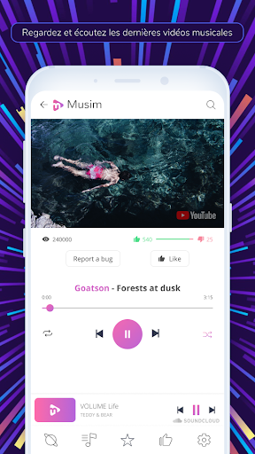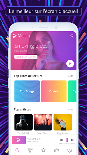 Musim est plus qu'un simple lecteur de musique standard. Il s'agit d'une nouvelle application pour téléphones et tablettes Android qui vous permet de rechercher vos artistes préférés, d'écouter de la musique et de regarder des vidéos sans publicité! Nous vous promettons un son et une vidéo de haute qualité, même avec la connexion Internet la plus faible. Trouvez et téléchargez immédiatement notre lecteur et profitez de la dernière musique que l'application recherche, en fonction de vos préférences. Seulement des succès accrocheurs, des chansons populaires, des vidéos intéressantes et des listes de lecture audio uniques, le tout gratuitement.