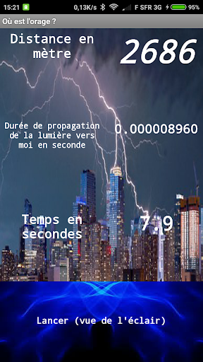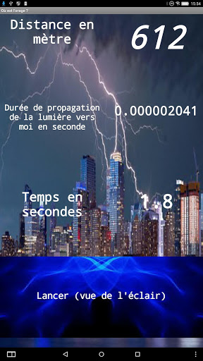 L'application permet de chronométrer le temps qui s'écoule entre l'éclair et le tonnerre. On en déduit le distance entre nous et l'orage. L'application calcule aussi la durée du trajet pour la lumière.
