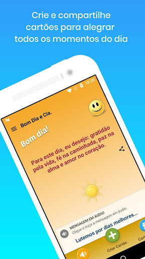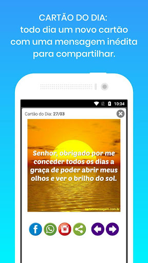 • Choisissez entre des dizaines de beaux messages de motivation, optimisme, images religieuses et évangéliques. • Sélectionnez simplement le type de message (bonjour, bon après-midi, bonne nuit, bon week-end, etc.), le texte, une image et La carte sera créée automatiquement.