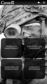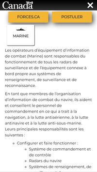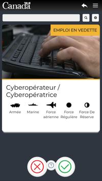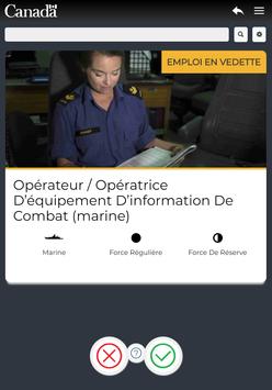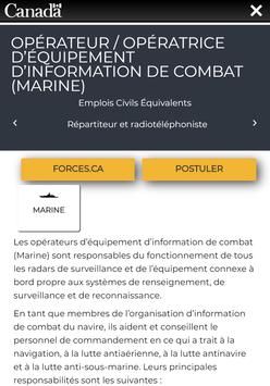Le but de cet application est d’informer, de manière dynamique et interactive, sur les différentes emplois à temps plein et partiel dans les Forces armées canadiennes. L’utilisateur est invité à créer son profil selon ses intérêts afin de voir apparaitre des métiers susceptibles de l’intéresser. En sélectionnant la fiche d’un métier, il est possible de connaitre toutes les spécificités de ce dernier, de visionner des vidéos et de connaître les prérequis nécessaires pour être éligible. Si l’utilisateur trouve le métier intéressant, il peut le sélectionner afin de le sauvegarder dans ses favoris et le consulter ultérieurement. En tout temps, l’utilisateur peut appliquer pour l’emploi de son choix.