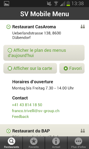 «Mobile Menu» vous permet de savoir en tout temps et partout ce que les restaurants SV de Suisse vous proposent. Choisissez un restaurant SV – il est peut-être à proximité – mémorisez vos favoris et informez-vous sur ce qui est d’actualité dans les restaurants du personnel ou les réfectoires. Pour chaque restaurant vous trouvez, outre le plan des menus et ce qui est d’actualité, les données de contact, les heures d’ouverture et le lieu du restaurant.