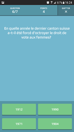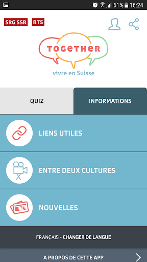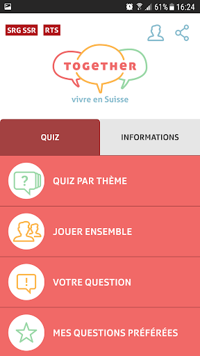 Testez vos connaissances sur la Suisse et jouez en famille ou entre amis. Vous y découvrirez de nombreux thèmes passionnants et un stock de questions enrichi en permanence. Proposez-nous dès aujourd'hui vos questions pour le quiz. Et surtout, l'app est disponible en sept langues: anglais, arabe, portugais, espagnol et bien sûr français, italien et allemand.