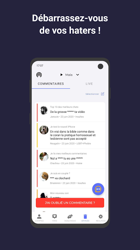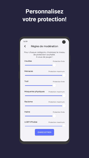 L'application analyse en temps réel les commentaires reçus puis les modère en masquant ou supprimant les commentaires polluants (pub, liens) et contenus haineux : racisme, homophobie, misogynie, moqueries sur le physique, insultes, harcèlement moral, trolls, etc.