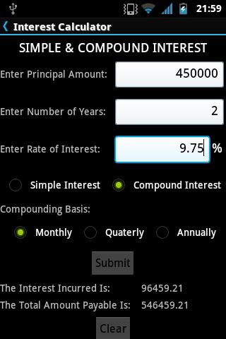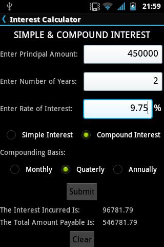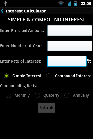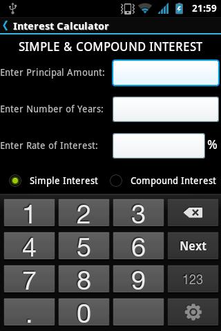 Cette application le rend relativement facile à calculer l'intérêt simple ainsi que l'intérêt composé en entrant simplement les valeurs.L'intérêt composé peut être calculé de différentes manières en fonction de la composition de la composition, telle que: