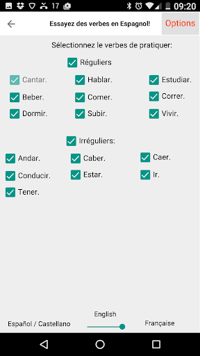 • Verbes Espagnols et temps verbaux à pratiquer et apprendre peuvent être sélectionnées / désélectionnées de la liste.
