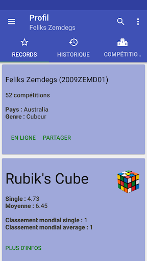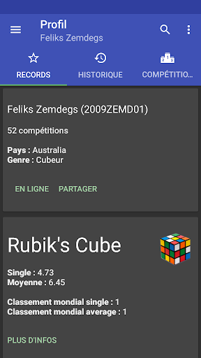 De plus, elle vous permet de suivre vos cubeurs favoris pour stocker leur scores hors-ligne et être informé si ils battent leur temps, quel que soit le type d'épreuve !