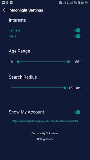 Au clair de lune, vous serez présenté aux personnes à votre emplacement. Vous aurez également la possibilité de rechercher d'autres personnes en dehors de votre emplacement. Dès que vous et votre match, indiquez oui les uns des autres, les conversations commenceront. Le clair de lune vous permet d'avoir des choix dans votre quête de votre partenaire de vie idéal.