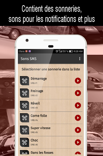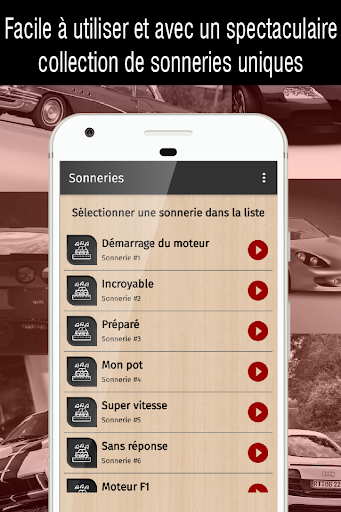 sonneries de voiture est une application conçue spécialement pour votre téléphone portable, avec une grande collection de sonneries voiture que vous pouvez utiliser comme: sonneries, sons sms, alarme ou notification.