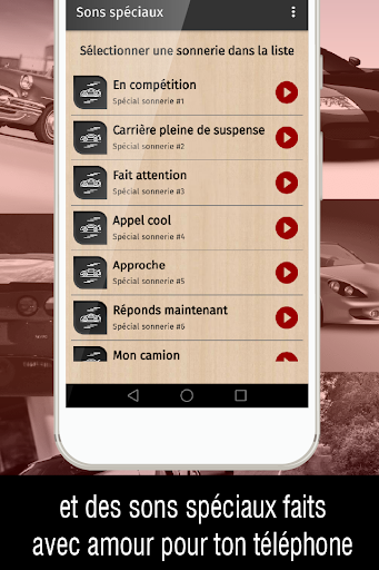 Vous recherchez de nouvelles sonneries pour votre appareil mobile? Téléchargez la nouvelle application sonneries voitures et personnalisez le son de votre appareil en choisissant celui que vous préférez parmi la grande variété de sons de téléphone gratuits disponibles.