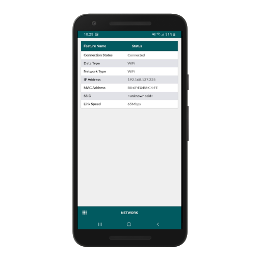 Network Info: Data Type, Network Type, IP Address,MAC Address, IP Address, SSID, Link Speed, WiFi, Unavailable, Connected etc.