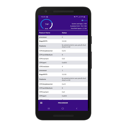 Processor info: Processor, Bogo MIPS, Features, CPU Implementer, CPU Architecture, CPU variant etc.