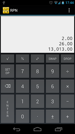 RPN is a four function calculator designed to replace the standard Android calculator. It features large buttons designed for easy touchscreen use. It operates using Reverse Polish Notation, uses high accuracy decimal arithmetic internally, and has a fixed point scrollable display.