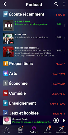 Les podcasts contiennent des nouvelles, des documentaires, des reportages, des cours de langue, des tests, des tendances et même de la comédie et couvrent une vaste portée d’options pour le divertissement. Avec la base de données de podcast qui sont mise à jour automatiquement, vous pouvez abonner des milliers d’épisodes de podcasts gratuit.