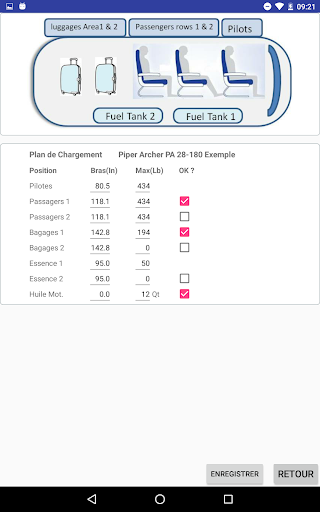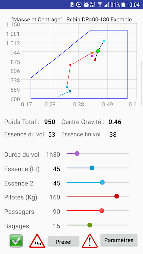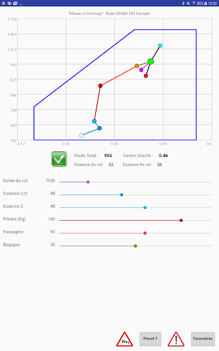 Affichage graphique du centre de gravité au début du vol, à la fin du vol et en cas de plein d'essence.