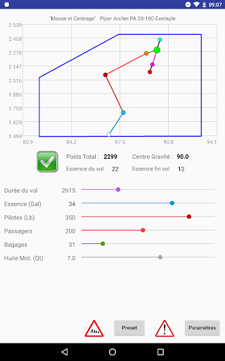 Alerte en cas de surcharge en poids, de sortie du centre de gravité de l'enveloppe de vol au début et en cours du vol, et